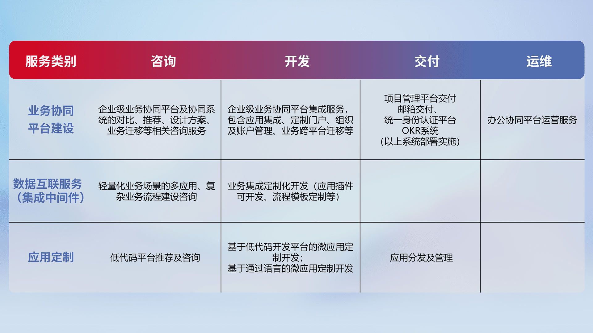 针对钉钉、、、企微、、IDaas等平台级产品提供产品的规划、、方案、、、、交付、、定制化开发等服务,,,,实现如统一协同办公、、智能客户服务、、、混合会议管理、、、智能数据查询、、等业务场景,,,实现数字化转型。。。