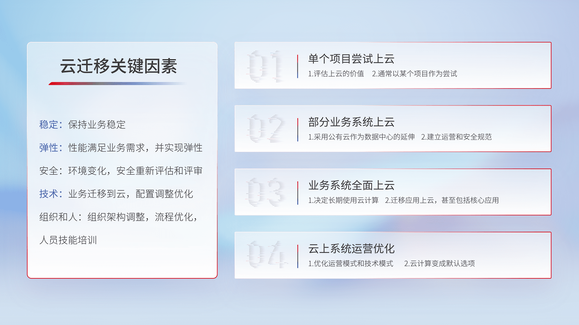 结合实际业务,,从规划设计、、云平台选型、、、云原生改造、、、数据迁移、、、集成交付,,迁移全过程为客户识别最佳上云路径,,,做好风险识别管理,,设计网络架构、、、、身份权限、、、安全审计合规、、操作审计、、、日志审计、、、监控告警策略、、、、多站点容灾设计等,,对云上基础设施进行整体规划,,提升IT治理水平,,,,以满足弹性、、、高可用、、、、高性能的需求。。。。