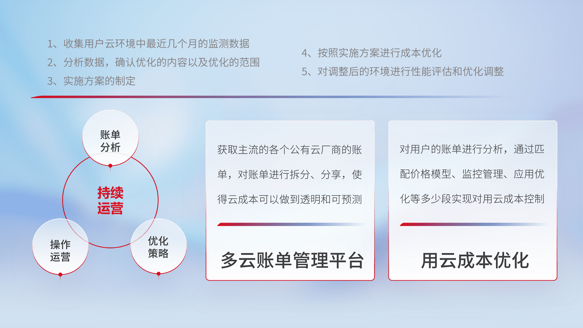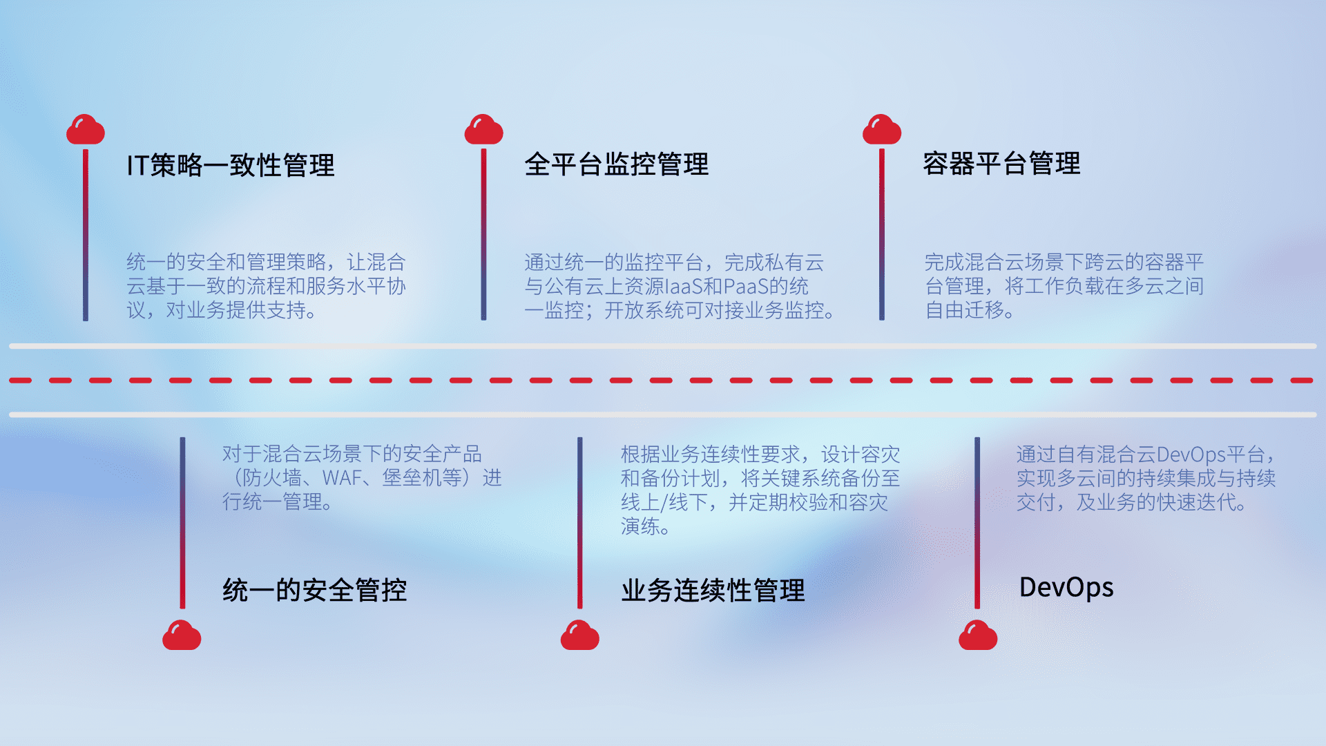 通过多云纳管,,,,以统一的资源数据模型把客户的云资源进行抽象和封装,,,进而实现对多云资源的统一操作,,,保障云资源管理的可靠性、、、稳定性与可用性。。。量身定制化运维内容,,配置、、开发运维、、、补丁管理、、、、备份、、、监控、、、、认证和访问管理、、、审计和日常巡检等,,,,保障在用云过程中的可靠度,,,,稳定度以及高可用率。。